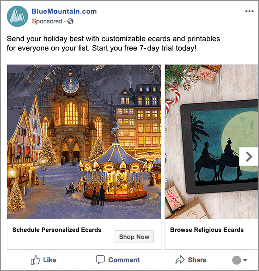 Social media ads are a great way to help brand awareness. We utilized carousel ads on both Facebook and Instagram. I designed ads for our three main brands, American Greetings, Blue Mountain, and Jacquie Lawson.