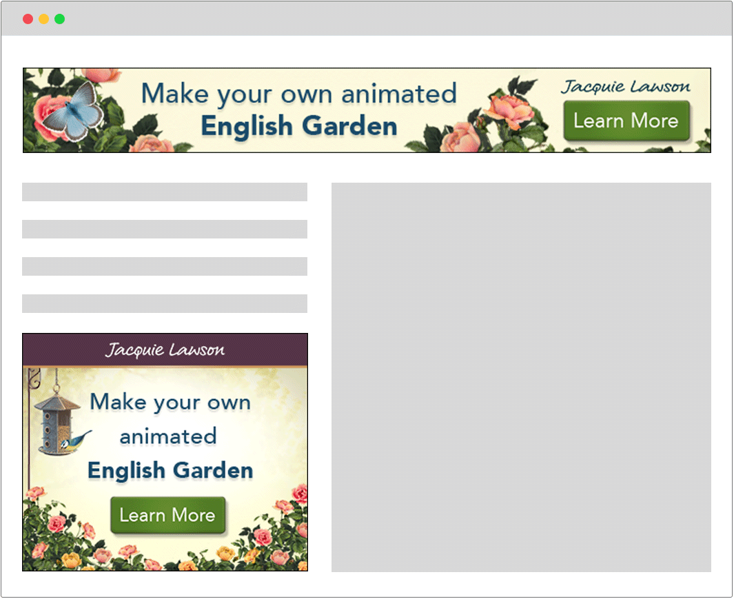 I created banner ads to promote holiday sales and large products. I created these ads to promote Jacquie Lawson’s interactive english garden. The online garden was a huge success and generated nearly 1 million dollars in revenue.